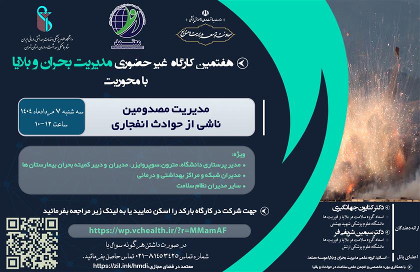موسسه عالی تربیت و توسعه مدیران نظام سلامت وزارت بهداشت در نظر دارد با همکاری ستاد هماهنگی بهداشت و درمان استان تهران، پیرو سلسله کارگاه های غیرحضوری مدیریت بحران و بلایا، کارگاه غیر حضوری با محوریت مدیریت مصدومین ناشی از حوادث انفجاری را به شرح ذیل برگزار نماید.