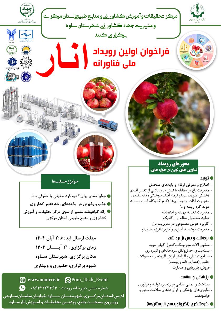 مرکز تحقیقات و آموزش کشاورزی و منابع طبیعی استان مرکزی، اولین رویداد ملی فناورانه انار بر مبنای حل چالش های راهبردی و مسئله محور را برگزار می نماید.